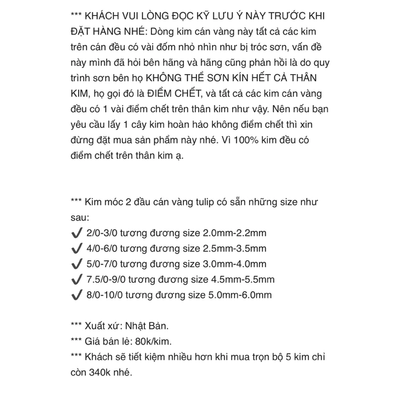 *** KHÁCH VUI LÒNG ĐỌC KỸ LƯU Ý NÀY TRƯỚC KHI ĐẶT HÀNG NHÉ: Dòng kim cán vàng này tất cả các kim trên cán đều có vài đốm nhỏ nhìn như bị tróc sơn, vấn đề này mình đã hỏi bên hãng và hãng cũng phản hồi là do quy trình sơn bên họ KHÔNG THỂ SƠN KÍN HẾT CẢ THÂN KIM, họ gọi đó là ĐIỂM CHẾT, và tất cả các kim cán vàng đều có 1 vài điểm chết trên thân kim như vậy. Nên nếu bạn yêu cầu lấy 1 cây kim hoàn hảo không điểm chết thì xin đừng đặt mua sản phẩm này nhé. Vì 100% kim đều có điểm chết trên thân kim ạ. *** Kim móc 2 đầu cán vàng tulip có sẵn những size như sau: ✔ 2/0-3/0 tương đương size 2.0mm-2.2mm ✔️ 4/0-6/0 tương đương size 2.5mm-3.5mm ✔️ 5/0-7/0 tương đương size 3.0mm-4.0mm ✔️ 7.5/0-9/0 tương đương size 4.5mm-5.5mm ✔️ 8/0-10/0 tương đương size 5.0mm-6.0mm *** Xuất xứ: Nhật Bản. *** Giá bán lẻ: 85k/kim. *** Khách sẽ tiết kiệm nhiều hơn khi mua trọn bộ 5 kim chỉ còn 400k nhé. ❌ Shop không có chính sách đổi trả hàng và sẽ không chịu trách nhiệm đối với trường hợp Quý khách chọn không đúng phân loại từng mã nên Quý khách vui lòng kiểm tra kĩ đơn hàng trước khi bấm đặt hàng.